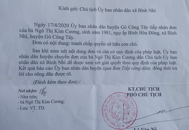 Ngày 21/4, Phó chủ tịch UBND huyện Gò Công Tây cũng có thông báo gửi bà C. về nội dung "tranh chấp quyền sở hữu con chó" như sau: "Sau khi xem xét nội dung đơn và căn cứ quy định của pháp luật, UBND huyện chuyển đơn của bà C. đến Chủ tịch UBND xã Bình Nhì để được xem xét giải quyết theo quy định của pháp luật".