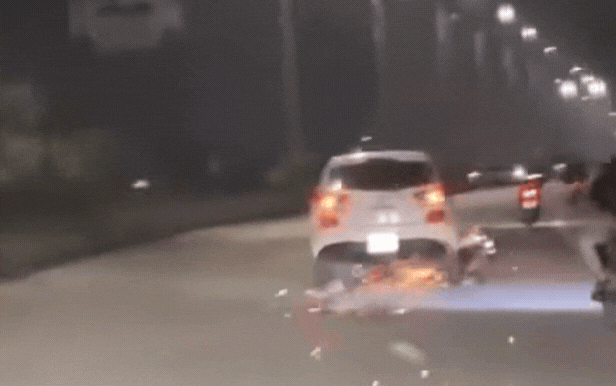 Sau khi xảy ra va chạm, người điều khiển xe máy xuống xe và dừng lại. Tuy nhiên, tài xế điều khiển ô tô tiếp tục lao đi và kéo theo phương tiện xe máy dưới đường (tạo thành vệt lửa).
