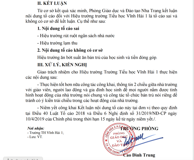 Từ cơ sở kết quả xác minh, Phòng GD-ĐT Nha Trang kết luận nội dung tố cáo đối với hiệu trưởng Trường Tiểu học V.H1 là tố cáo sai và không có cơ sở.