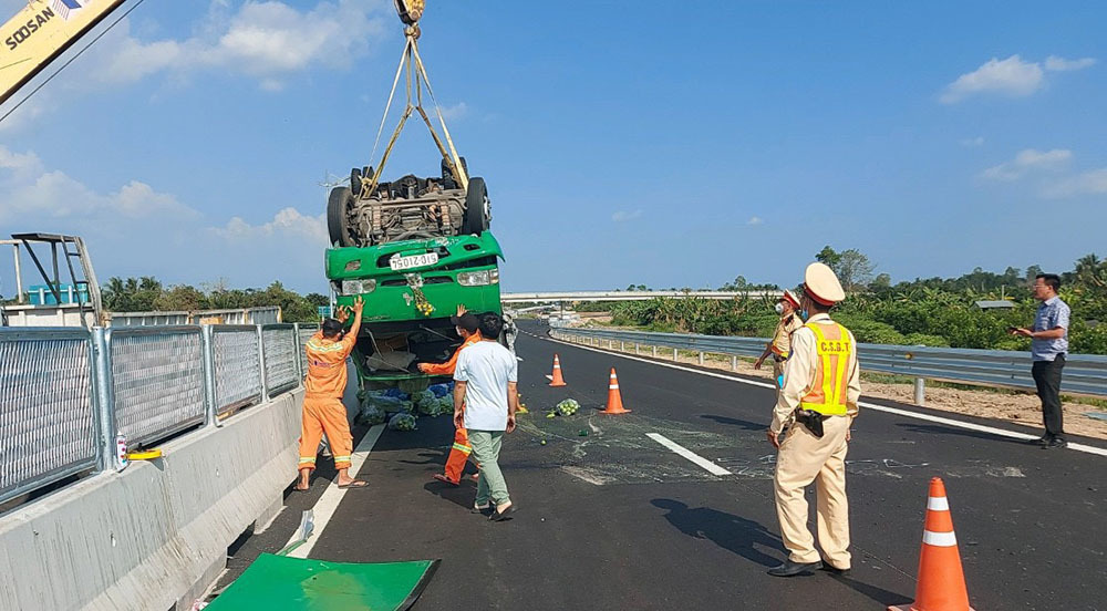 Khoảng 14h cùng ngày, xe tải chở rau củ, chạy trên cao tốc Trung Lương - Mỹ Thuận, hướng miền Tây đi Sài Gòn, khi đến đoạn xã Mỹ Hội (huyện Cái Bè) va vào dải phân cách, lật ngang.