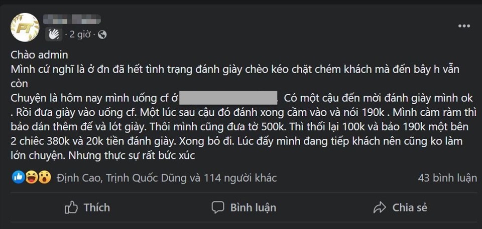 Tuy nhiên, sau khi đánh giày xong, thanh niên này đem giày vào trả anh và lấy giá 400.000 đồng với lý do là thêm lót giày và dán đế. Sự việc khiến anh rất bất ngờ vì bản thân không yêu cầu người này dán giày, lót đế.