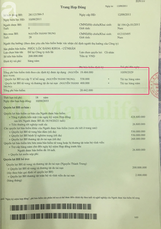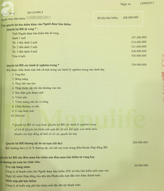 Cụ thể, anh Trung cho biết, bảo hiểm được ký ngày 12/9/2011, tổng số tiền bảo hiểm là 268 triệu đồng. Ngay sau ký hợp đồng, khách hàng thanh toán năm đầu tiên 20.442.000 đồng.