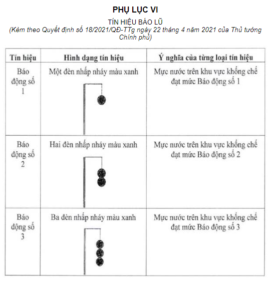 Tại Phụ lục VI kèm theo Quyết định 18/2021/QĐ-TTg có quy định về tín hiệu báo lũ như sau: