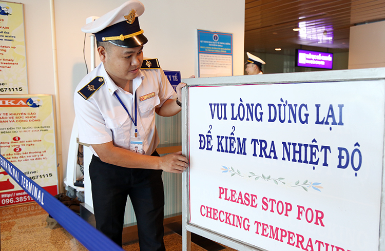 Nhân viên của Trung tâm Kiểm dịch y tế quốc tế theo dõi thân nhiệt khách tại sân bay quốc tế Cam Ranh, Khánh Hòa. Ảnh: Xuân Ngọc.