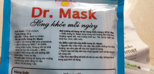 Một sản phẩm khác của của công ty trên là túi gồm 10 chiếc khẩu trang y tế cũng được khẳng định trên nhãn là "lọc bụi, lọc ô nhiễm >99%; ngăn ngừa khói bụi, virus, nấm mốc".
