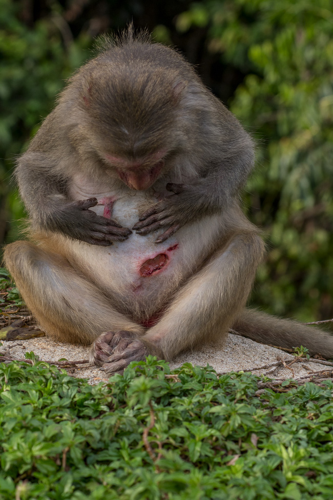 Đáng chú ý, những chú khỉ trong loạt ảnh đang gây sốc cộng đồng mạng có một điểm chung là đều mang thương tật đầy mình. Con cụt chân, con cụt tay, thậm chí lòi xương... và cả những vết thương còn đang rỉ máu. Không ít trong số chúng cụt 2-3 chi, chỉ riêng việc di chuyển đã vô cùng khó khăn chứ chưa nói tới việc kiếm ăn.