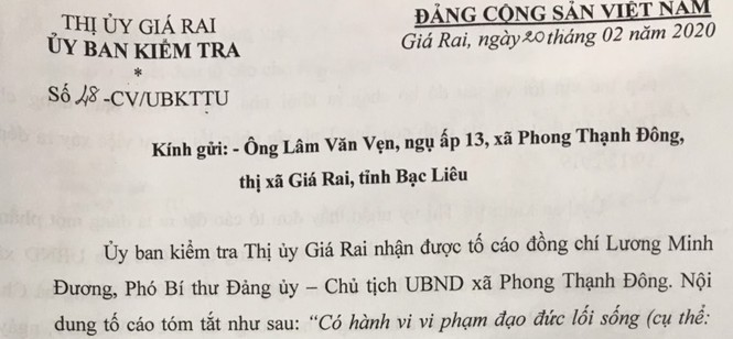 Thông báo của Uỷ ban Kiểm tra Huyện uỷ Giá Rai.
