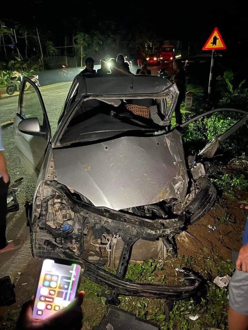 Cú va chạm mạnh khiến xe đầu kéo mất lái, lao vào vệ đường. Ô tô 5 chỗ hư hỏng nghiêm trọng, đầu xe móp méo, vỡ nát, người tài xế cũng bị thương nặng.