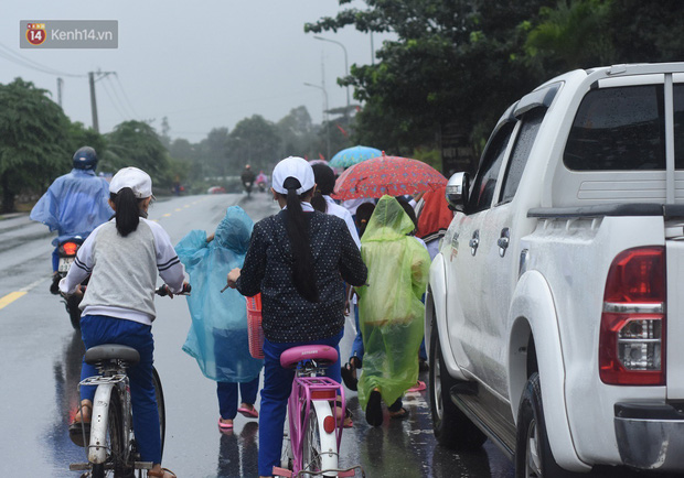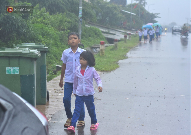 Nhiều em phải đi bộ và không có áo mưa nên ướt đẫm.