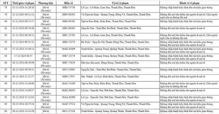 Danh sách tổng cộng 99 phương tiện, bao gồm ôtô và xe máy. Các hành vi phổ biến bị xử phạt nguội là "Không chấp hành hiệu lệnh đèn tín hiệu giao thông", "Không đội mũ bảo hiểm cho người đi mô tô", "Chở người ngồi trên xe không đội mũ".