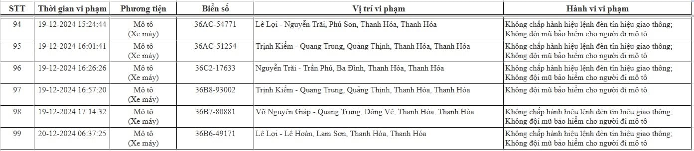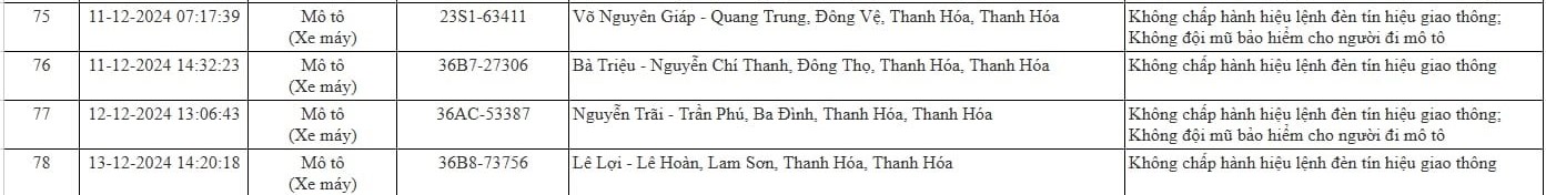 Theo Công an tỉnh Thanh Hóa, Công an thành phố Thanh Hóa đã có thông báo kết quả phát hiện xử phạt nguội qua hệ thống camera giám sát giao thông trên địa bàn thành phố từ ngày 11.12.2024 đến 20.12.2024.