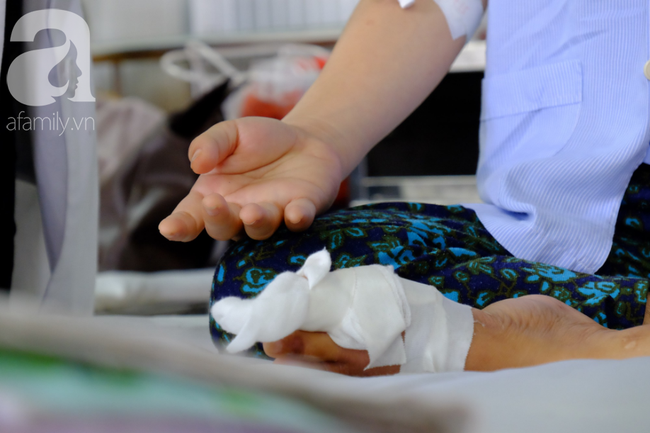 Cố gắng ngồi dậy, người mẹ nắm lấy đôi bàn tay nhỏ xíu của con trai. Thấy những người xung quanh đang chăm chú nhìn mình, chị Hương mỉm cười nhưng mặt thì buồn lắm.