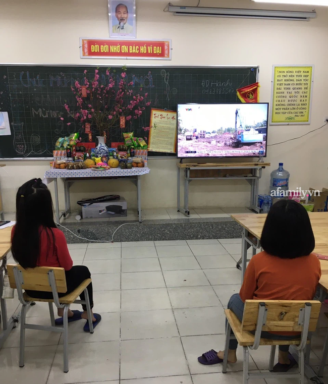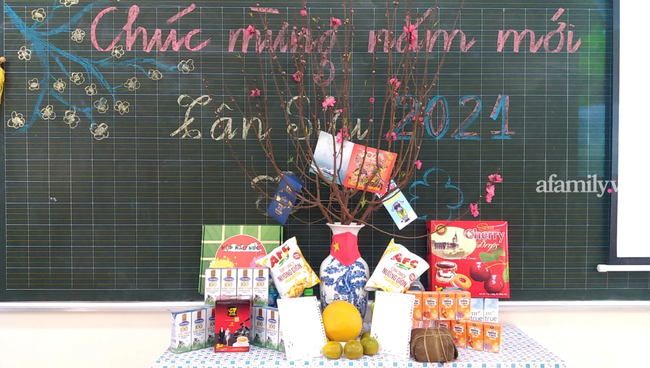 Sáng 30 Tết: Không có mùi hương trầm nhẹ nhàng lan tỏa khắp nhà, không có tiếng lách cách chuẩn bị bữa cơm tất niên của bà, của mẹ, không có dáng ông đứng nghiêm trang trước bàn thờ tổ tiên. Trong từng phòng học, các bố, mẹ và con trang trí cho tấm bảng thêm sinh động, sửa sang lại cành đào và mâm ngũ quả. Chắc không có mâm ngũ quả ở bất cứ nơi nào bày cả đồ chơi, sữa, bim bim, nước ngọt và cả khẩu trang. Các phòng học đều rất ấm cúng.