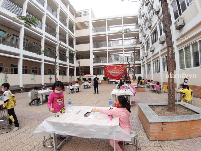Buổi chiều, các con tô tượng, vẽ tranh. 57 học sinh chia thành 2 ca, lần lượt theo tiếng loa gọi xuống sân chơi. Các con ngồi ở sân phía trong, vừa kín gió vừa rộng rãi và đảm bảo khoảng cách 2m.