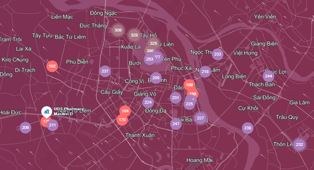 Ba Đình: 205 US AQI (màu tím), chất lượng không khí rất không tốt.