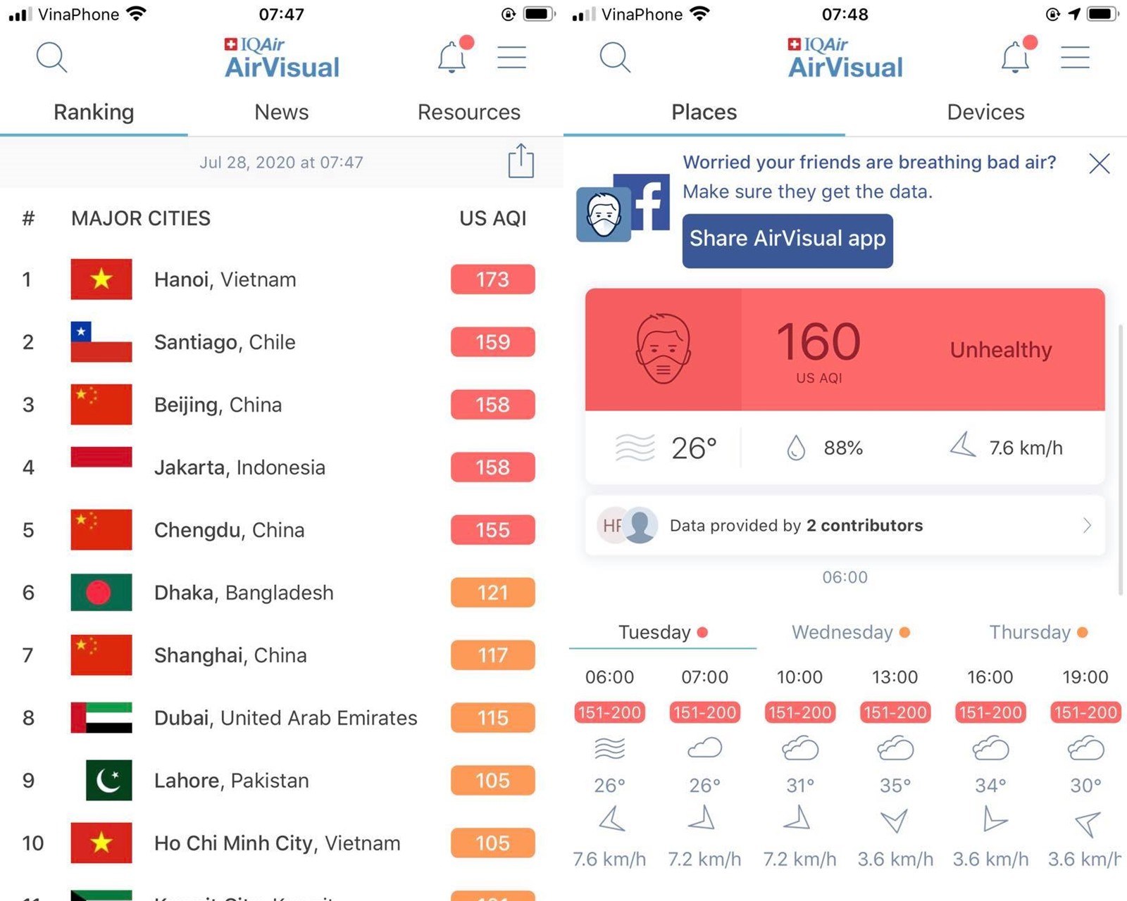 Trạm quan trắc Air Visual (thuộc Tổ chức IQAir có trụ sở chính tại Thụy Sỹ) ghi nhận vào lúc 7h47 ngày 28/7, có chỉ số AQI ở mức 173 và đứng ở vị trí ô nhiễm nhất thế giới ở thời điểm đó, xếp trên cả Chile, Trung Quốc, Indonesia,...