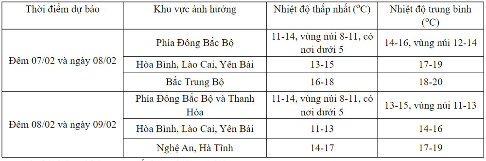 Trong đợt không khí lạnh này nhiệt độ thấp nhất ở khu vực Bắc Bộ phổ biến từ 11-13 độ, vùng núi từ 8-10 độ, vùng núi cao có nơi dưới 5 độ; khu vực Bắc Trung Bộ từ 14-17 độ.