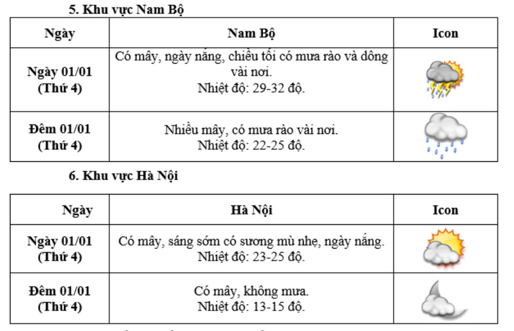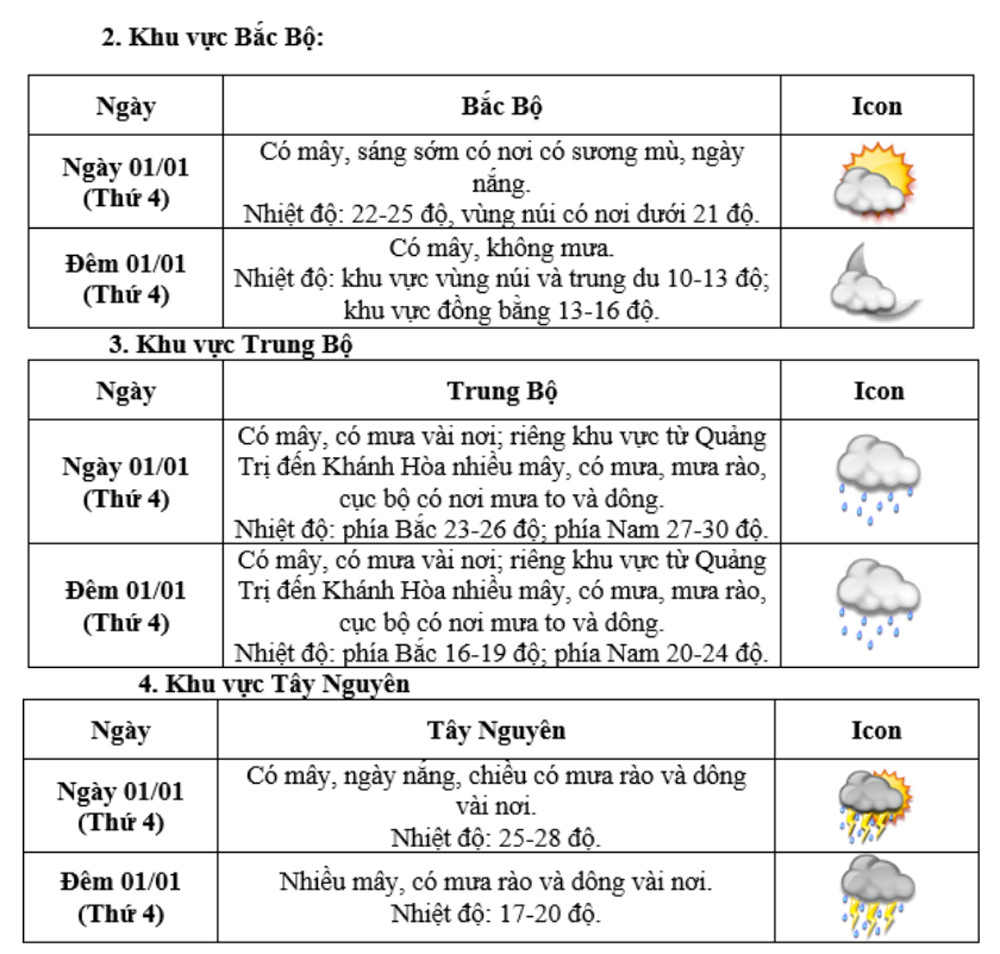 Các khu vực khác có mưa rào và giông vài nơi; riêng Tây Nguyên và Nam Bộ thời kỳ từ 2-4/1 có mưa rào và giông rải rác. Trong mưa giông có khả năng xảy ra lốc, sét và gió giật mạnh.