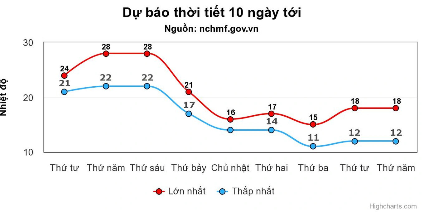 Theo dự báo xa của Trung tâm khí tượng, Hà Nội ghi nhận mức giảm nhiệt xuống ngưỡng 17 độ từ đêm 16/12, sau đó tiếp tục giảm sâu trong những ngày tiếp theo. Thời điểm rét nhất trong đợt tới là ngày và đêm 19/12, nhiệt độ chỉ ở ngưỡng 11-15 độ, thấp nhất kể từ đầu mùa.