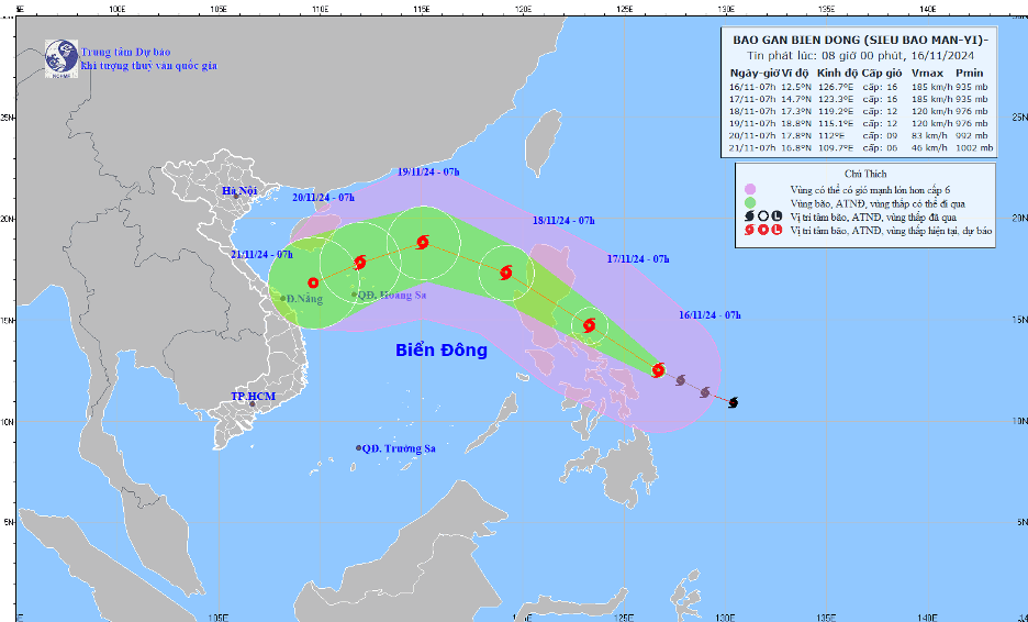 Dự báo trong 24 giờ tới, siêu bão Man-yi di chuyển chủ yếu theo hướng Tây Bắc, duy trì cường độ cấp 16. Đến khoảng chiều mai (17/11), siêu bão Man-yi sẽ đổ bộ vào khu vực đảo Luzon (Philippines) và suy yếu dần, khoảng sáng ngày 18/11 bão Man-yi sẽ di chuyển vào Biển Đông, trở thành cơn bão số 9 ảnh hưởng đến nước ta trong mùa bão lũ năm nay.