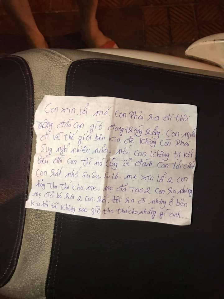 Con rất nhớ... Mẹ xin lỗi 2 con, hãy tha thứ cho mẹ. Mẹ đã tạo ra 2 con nhưng mẹ đã bỏ rơi 2 con. Tôi ra đi nhưng ở bên kia, tôi sẽ không bao giờ tha thứ cho những gì anh...".