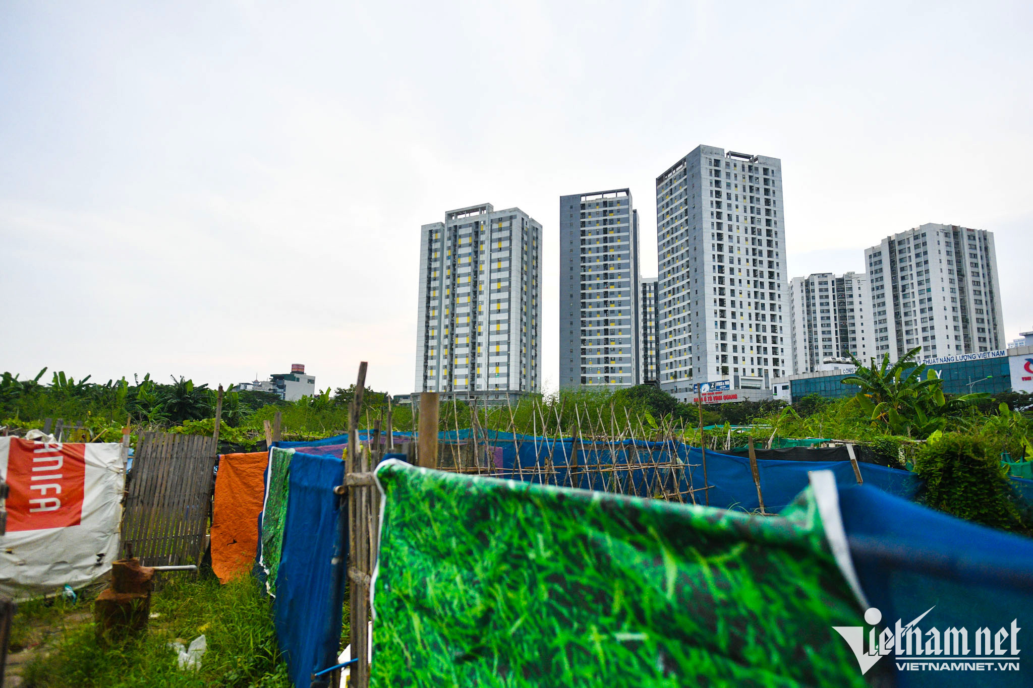 Những khu đất xây dựng được quây tôn kín, bên ngoài thưa vắng người qua lại.