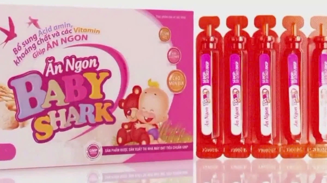 Baby Shark là sản phẩm thực phẩm bảo vệ sức khỏe được ghi nhãn là bổ sung acid amin, khoáng chất và các vitamin giúp ăn ngon.