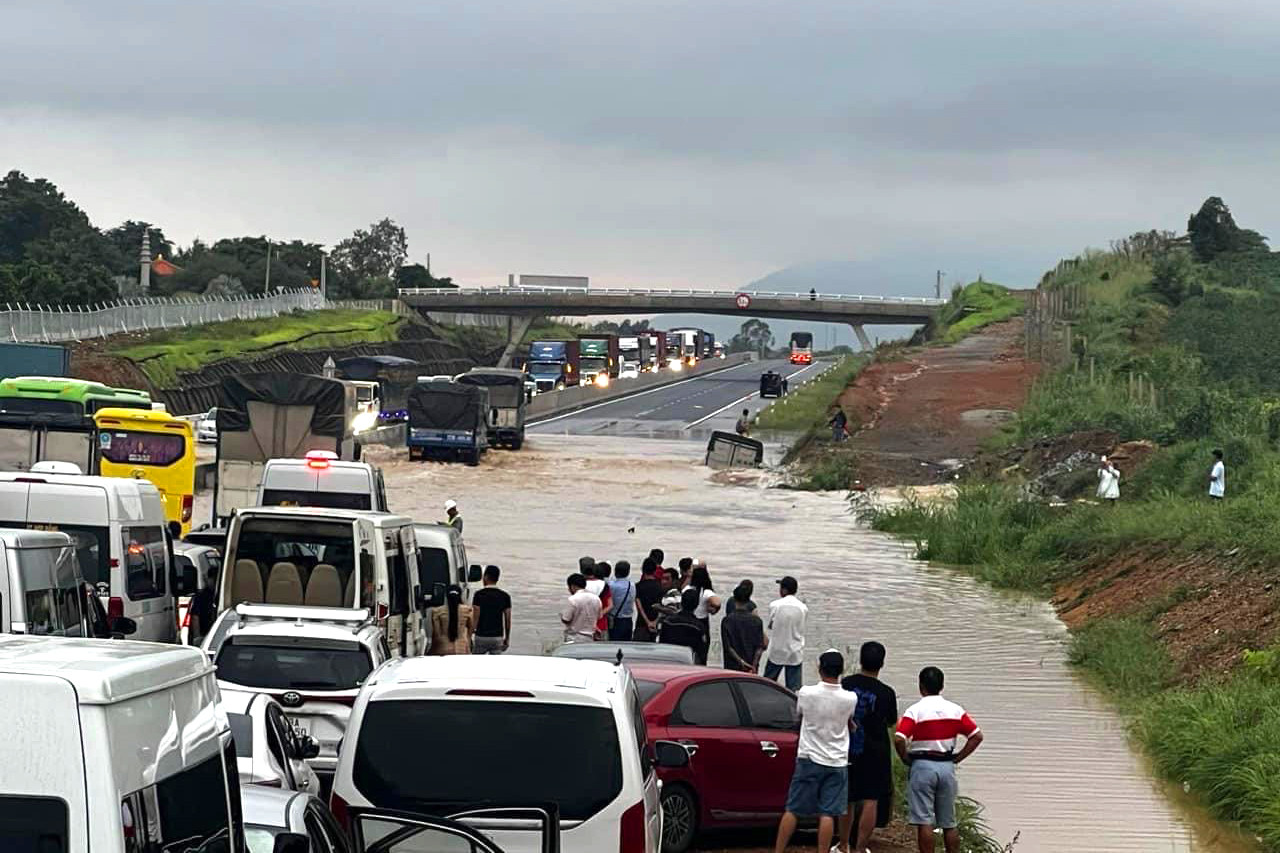 Nặng nhất là đoạn trũng gần Km25, qua xã Sông Phan, huyện Hàm Tân (tỉnh Bình Thuận), bị ngập sâu nhất gần 1m, kéo dài hơn 100m dẫn đến tình trạng kẹt xe nghiêm trọng trên cao tốc.