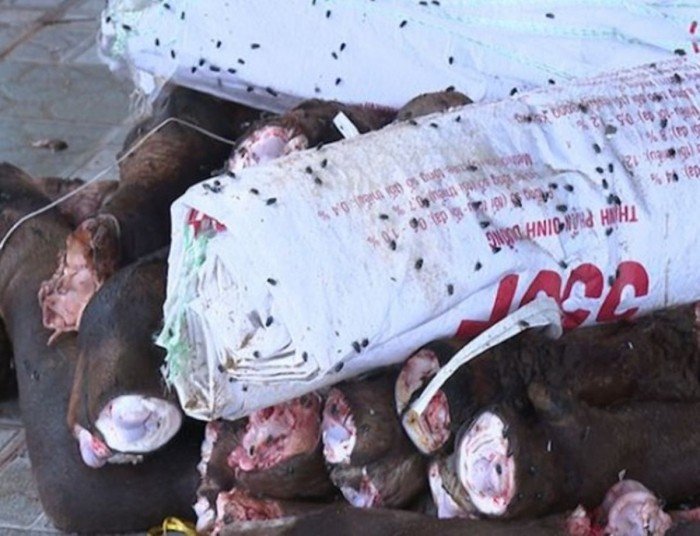 Quá trình kiểm tra cho thấy trong các kho đang lưu trữ số lượng lớn phụ phẩm trâu, bò gồm đuôi, chân, xương, gân với tổng trọng lượng gần 6 tấn. Nhiều sản phẩm có biểu hiện đổi màu, bốc mùi hôi, không đảm bảo điều kiện vệ sinh nhưng vẫn được bảo quản để tiếp tục sơ chế, phân loại.