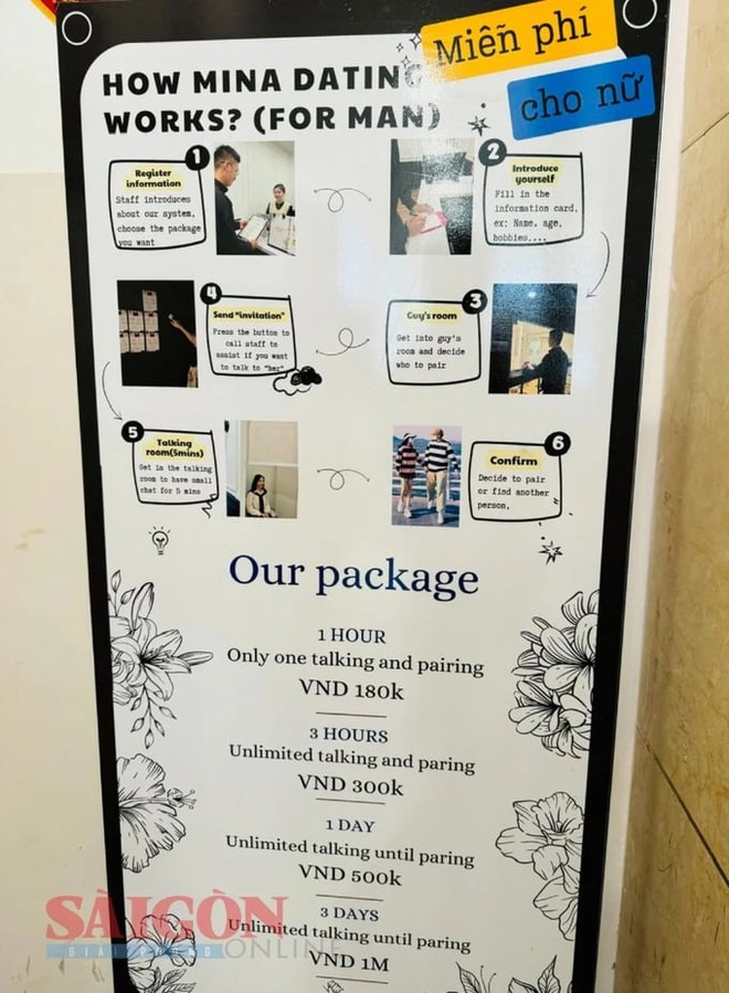 Gói dịch vụ 3 ngày, khách bỏ ra 1 triệu đồng để được ghép đôi, trò chuyện không giới hạn; đồng thời, khách nam còn phải gọi nước uống với phí dịch vụ từ 80.000 đồng - 100.000 đồng.