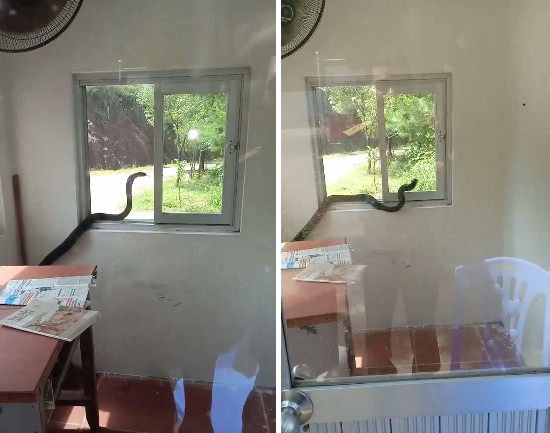 Trong đoạn clip, con rắn hổ mang trườn bò khắp cabin phòng bảo vệ, trên bàn, tường và cửa sổ. Con rắn có bộ da đen bóng, dài khoảng hơn 1 mét, mang phình rộng và liên tục thè lưỡi.