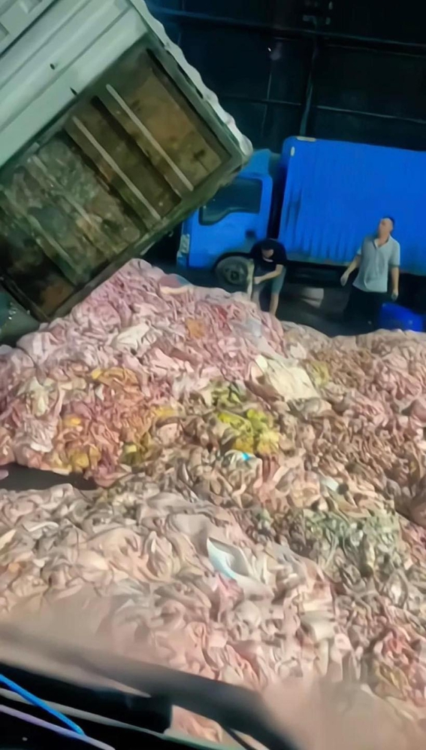 Theo những hình ảnh được chia sẻ trên MXH, từ trên những chiếc xe tải lớn, hàng trăm kilogam nội tạng động vật các loại được đổ đống giữa sàn bê tông của một kho hàng. Từ tai heo đến nầm, lòng lợn,... tất cả đều không được đóng gói vào túi mà cứ thế đổ từ trên thung xe tải xuống dưới sàn thành đống lớn. Bên cạnh đó có 2-3 người đàn ông tay trần, chân trần đang chuẩn bị phân loại.