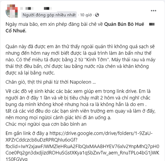 Về các đồ vệ sinh khác các bác xem giúp em trong link drive. Em là người ăn ở đây 1 lần, về bị tiêu chảy mất 2 hôm và chỉ nghĩ chắc bụng dạ mình không khỏe nhưng hoá ra là không hẳn là do em. Tất cả các video đều do các bạn sinh viên trường em quay và làm ở đấy, nên mong mọi người cảnh giác khi đi ăn uống ạ. Chúc mọi người qua cơn bão bình an".