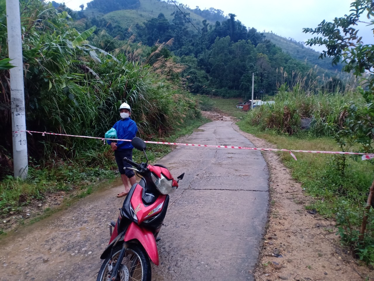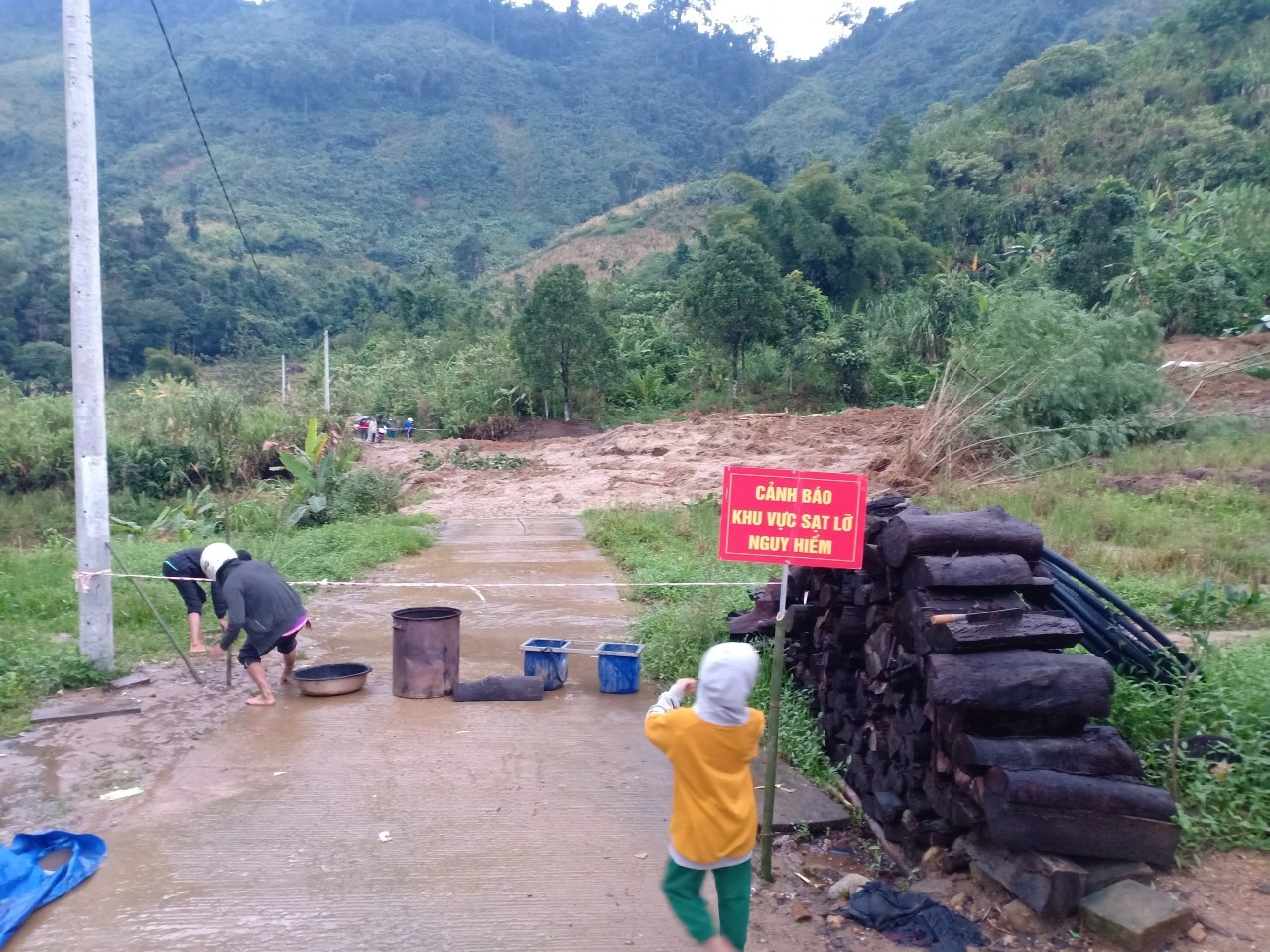"Để đảm bảo an toàn tính mạng cho người dân trong thôn và người đi đường, xã Trà Cang đã căng dây cảnh báo khu vực quả đồi sạt lở, đồng thời cử lực lượng túc trực để cảnh báo người qua lại.