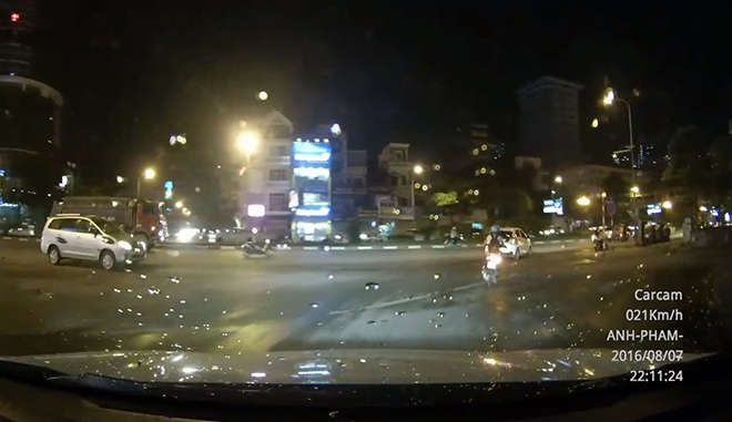 Thông tin ban đầu, chiếc Innova 7 chỗ lưu thông trên đường Trần Duy Hưng rẽ phải vào phố Trung Kính (Hà Nội) thì bất ngờ gặp xe máy lao nhanh cắt ngang đầu xe.