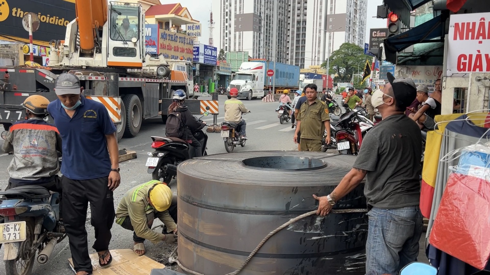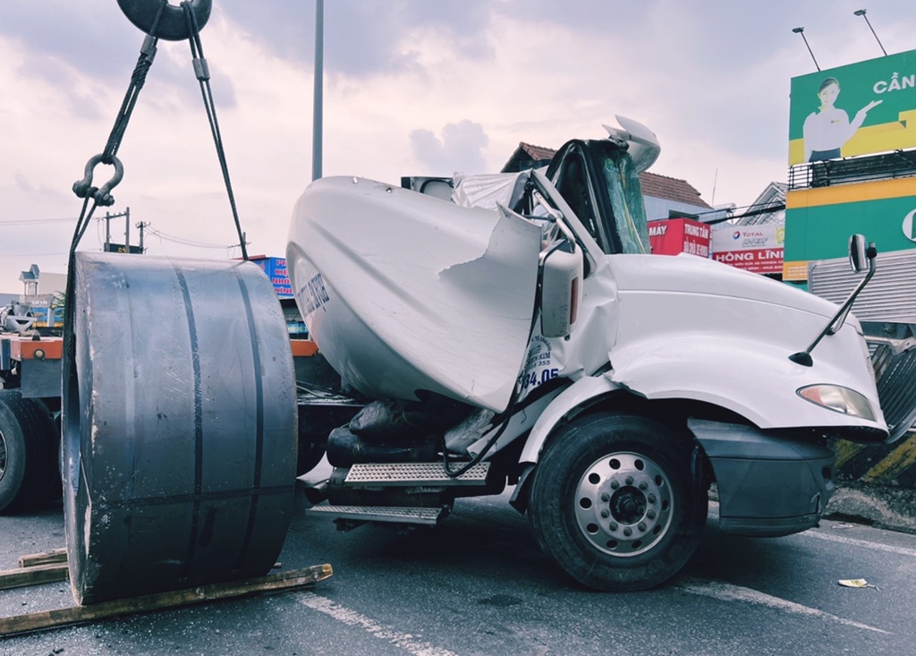 Cú thắng gấp làm cuộn tôn trên rơ mooc bị đứt xích, lăn về trước đè lên cabin xe, sau đó rơi xuống đường lăn lên vỉa hè. Tại hiện trường, phần cabin bị đè biến dạng nhưng rất may nam tài xế không bị thương. Mặt đường và vỉa hè bị đè lún theo một hình tròn.
