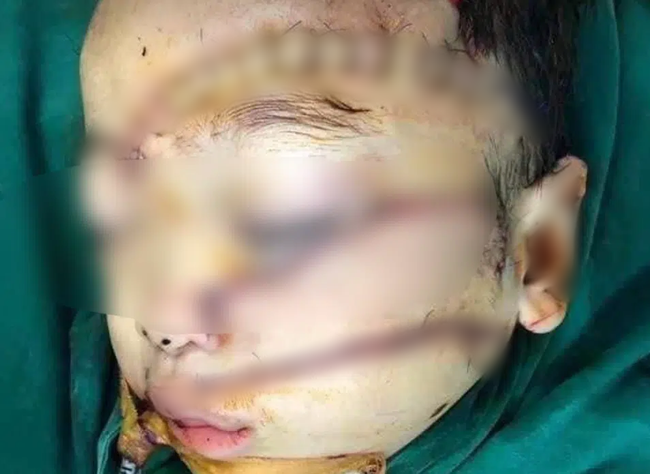 Trước đó vào chiều 10/1, bé Kh. được hàng xóm đưa đến BV trong tình trạng mất nhiều máu, mặt có nhiều vết thương bị chém sâu nham nhở, đứt hộp sọ, đứt xương hàm, rách màng não...