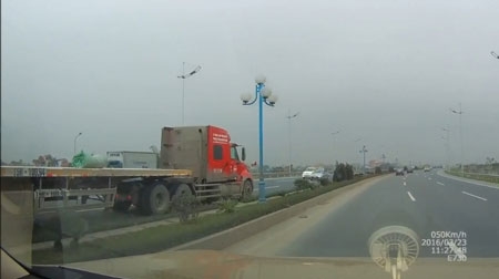 Đoạn video do độc giả có tên L.H.M gửi về Báo Giao thông do chính camera hành trình trên xe ô tô của mình ghi lại cảnh một chiếc xe tải đầu kéo sơ mi romooc mang BKS 15C-147.60 đang phóng với tốc độ cao, chạy ngược chiều trên tuyến đường Võ Nguyên Giáp, Hà Nội vào lúc 11h30 phút ngày 23/3, gây nguy hiểm cho các phương tiện khác đang tham gia giao thông. Mặc dù xe không chở theo container nhưng với lượng xe cộ đi lại đông đúc như trên đường Võ Nguyên Giáp, tai nạn có thể xảy ra bất kỳ lúc nào.