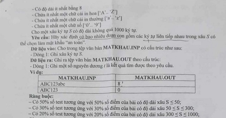 Cụ thể, ở câu này, đề thi đưa ra một ví dụ. Trong ví dụ, yêu cầu độ dài tối thiểu là 8. Nếu là 8 thì trong câu ví dụ một không thể có 8 xâu. Kết quả đúng là 3. Tuy nhiên, trong đáp án của dữ liệu ví dụ thì lại thành 8. Có nghĩa là ví dụ này không đúng với yêu cầu của bài toán.