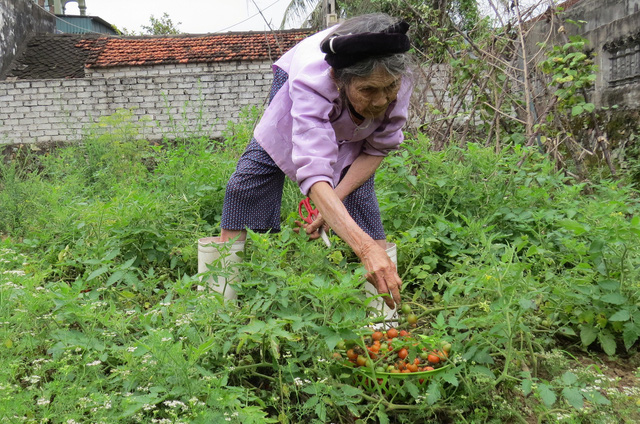 Cụ bà từ ngoài vườn nói vọng vào: "Đồ ăn thức uống cho gia đình tôi từ trong vườn này cả. Chúng tôi chỉ dùng thực phẩm trong làng thôi. Rất sạch và đảm bảo. Nhà tôi có nhiều cà nên mang ra chợ bán cho bà con trong làng. Có nhà thì bán rau, hành mùi. Ra chợ chúng tôi đổi cho nhau rau củ cũng được. Vừa vui, vừa tình cảm".