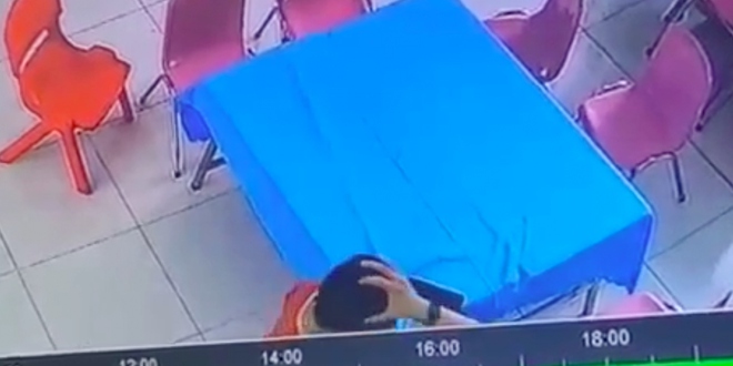 Cụ thể, video trích xuất từ camera của trường mầm non vào cuối tháng 3 cho thấy, sau giờ ăn trưa, chỉ còn 2-3 em vẫn đang ngồi ở bàn ăn, giáo viên này đã ngồi ở góc khuất camera để đút cho học sinh còn lại.