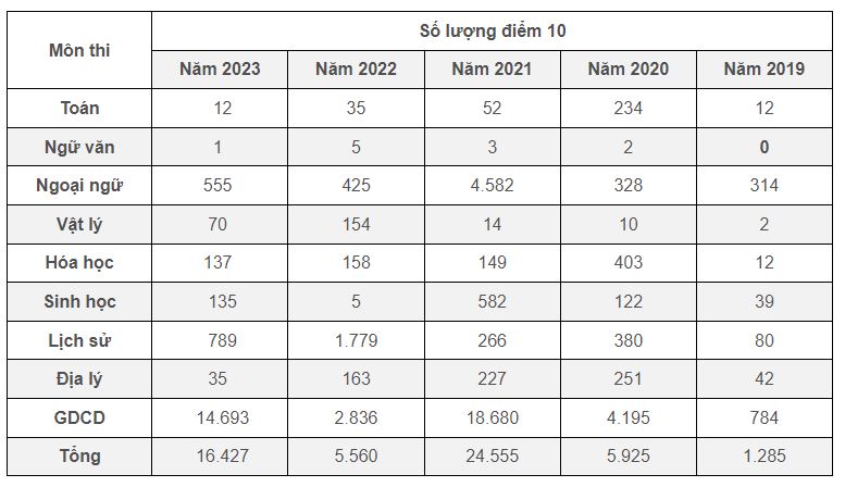 Môn Toán có 12 điểm 10, môn Địa lí có 35 điểm 10, Vật lý có 70 điểm 10, môn Sinh học có 135 điểm 10, môn Hóa học có 137 điểm 10, môn tiếng Anh có 555 điểm 10, môn Lịch sử có 789 điểm 10.