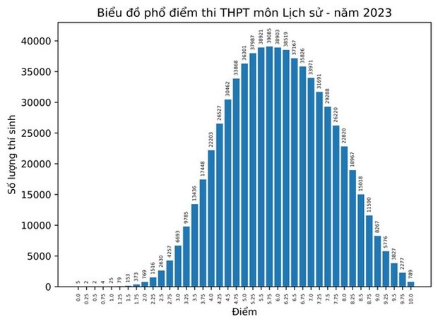 Kết quả phân tích phổ điểm thi tốt nghiệp THPT môn Lịch sử của cả nước năm 2023 cho thấy: Có 683,447 thí sinh tham gia thi bài thi Lịch sử, trong đó điểm trung bình là 6.03 điểm, điểm trung vị là 6.0 điểm; điểm số có nhiều thí sinh đạt nhất là 5.75 điểm. Số thí sinh có điểm <= 1 là 38 (chiếm tỷ lệ 0.006%); số thí sinh đạt điểm dưới trung bình là 170,237 (chiếm tỷ lệ 24.91%).