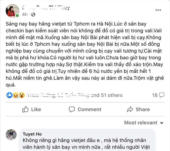 Kỳ thủ nhiều lần vô địch quốc gia Đ.D kể về tình huống trớ trêu mà cô gặp phải: "Sáng nay, bay hãng Vietjet từ TP HCM ra Hà Nội, lúc ở sân bay check-in, bạn kiểm soát viên có nói khách không nên để đồ có giá trị trong vali. Vali mình khóa mật mã nhưng khi xuống sân bay Nội Bài, phát hiện vali bị cạy, không biết bị ở TP HCM hay khi xuống sân bay Nội Bài nữa. Một số đồng nghiệp bay cùng chuyến cũng bị cạy vali tương tự. Cài mật mã thì bị phá hư khóa. Có người bị hư vali luôn...Sợ thật. Kiểm tra vali thấy đồ xáo trộn. May không để đồ có giá trị. Tuy nhiên, để 6 hũ nước yến bị mất hết 1 hũ. Mất niềm tin ghê. Làm ăn vậy sau này ai dám đi nữa. Trộm vặt ghê quá!".
