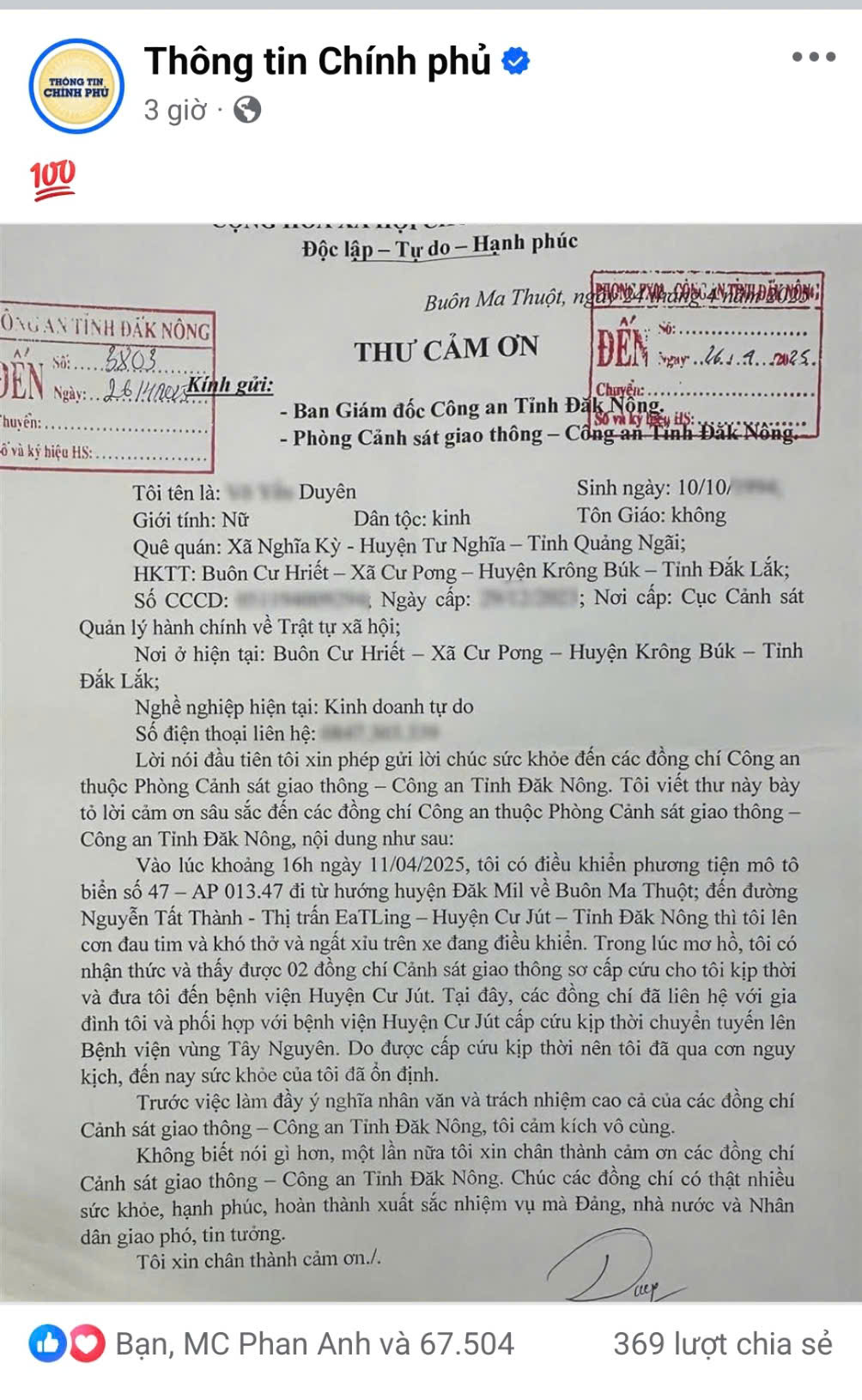 Tối ngày 2/5, trên Fanpage Cổng thông tin Chính phủ đã đăng tải lá thư của một phụ nữ gửi cảm ơn Công an tỉnh Đắk Nông đã thu hút gần 70.000 lượt like và hàng trăm lượt chia sẻ chỉ sau vài giờ đăng tải.