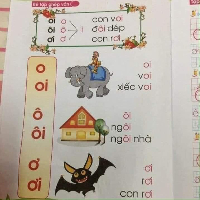Mới đây nhất, dưới trang bài tập có tên "Bé tập ghép vần" được một mẹ chia sẻ, rất nhiều người khẳng định chính là nội dung trong sách tiếng Việt lớp 1. Đây vốn là bài tập ghép vần oi, ôi, ơi, nhưng mọi chuyện sẽ không có gì đáng nói nếu ở vần "ơi" thay vì từ ghép là "con dơi" thì sách này lại ghi thành "con rơi". Đây là một lỗi sai cơ bản không nên có nếu thực sự được đưa vào tài liệu được xem là "khuôn vàng thước ngọc" như sách giáo khoa lớp 1.
