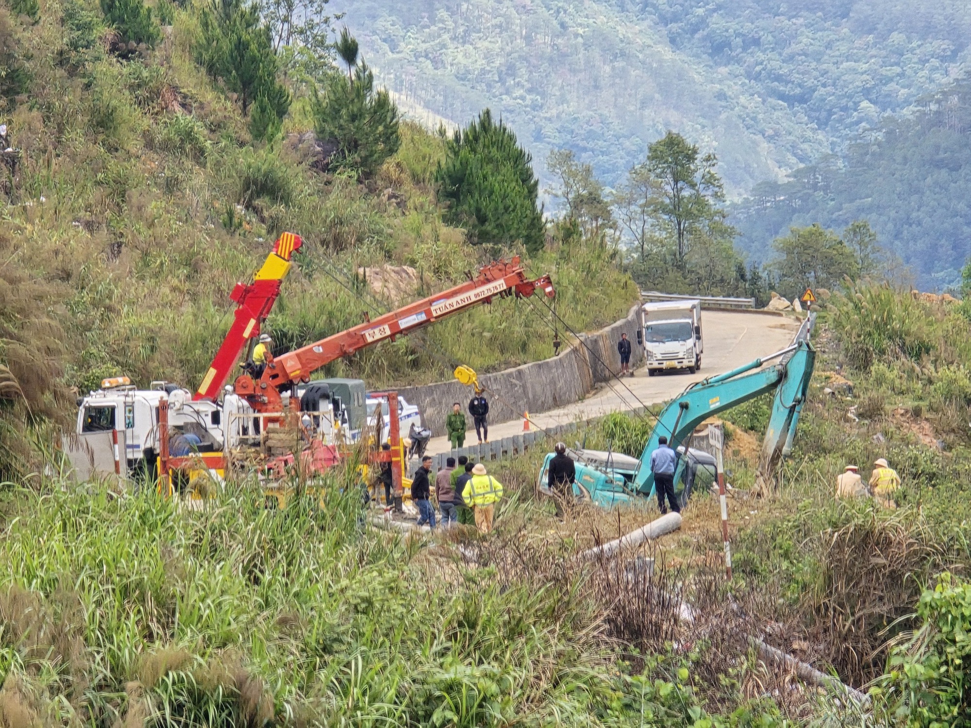 Ghi nhận tại hiện trường cho thấy vực này sâu hàng chục mét, chiếc xe container hư hỏng nặng, biến dạng phần đầu. Lực lượng cứu hộ đang triển khai cứu hộ phương tiện gặp nạn lên mặt đường.