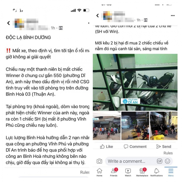 Sáng nay, mạng xã hội facebook chia sẻ thông tin người đàn ông bị mất chiếc xe máy hiệu Winner khi để tại chung cư ở phường Dĩ An, thành phố Dĩ An. Xe có gắn định vị nên anh này lần theo và nhờ lực lượng Cảnh sát giao thông tỉnh Bình Dương đang làm nhiệm vụ gần đó hỗ trợ truy vết.