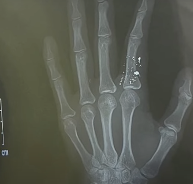 Bác sĩ Nguyễn Mạnh Chiến, Trung tâm chống độc, Bệnh viện Bạch Mai, cho biết tại đây bệnh nhân được chẩn đoán bị nhiễm độc thủy ngân với tình trạng ngón 2 bàn tay trái sưng nề, đồng thời trên phim chụp có rất nhiều hạt thủy ngân ở ngón tay chưa thoát được ra ngoài.