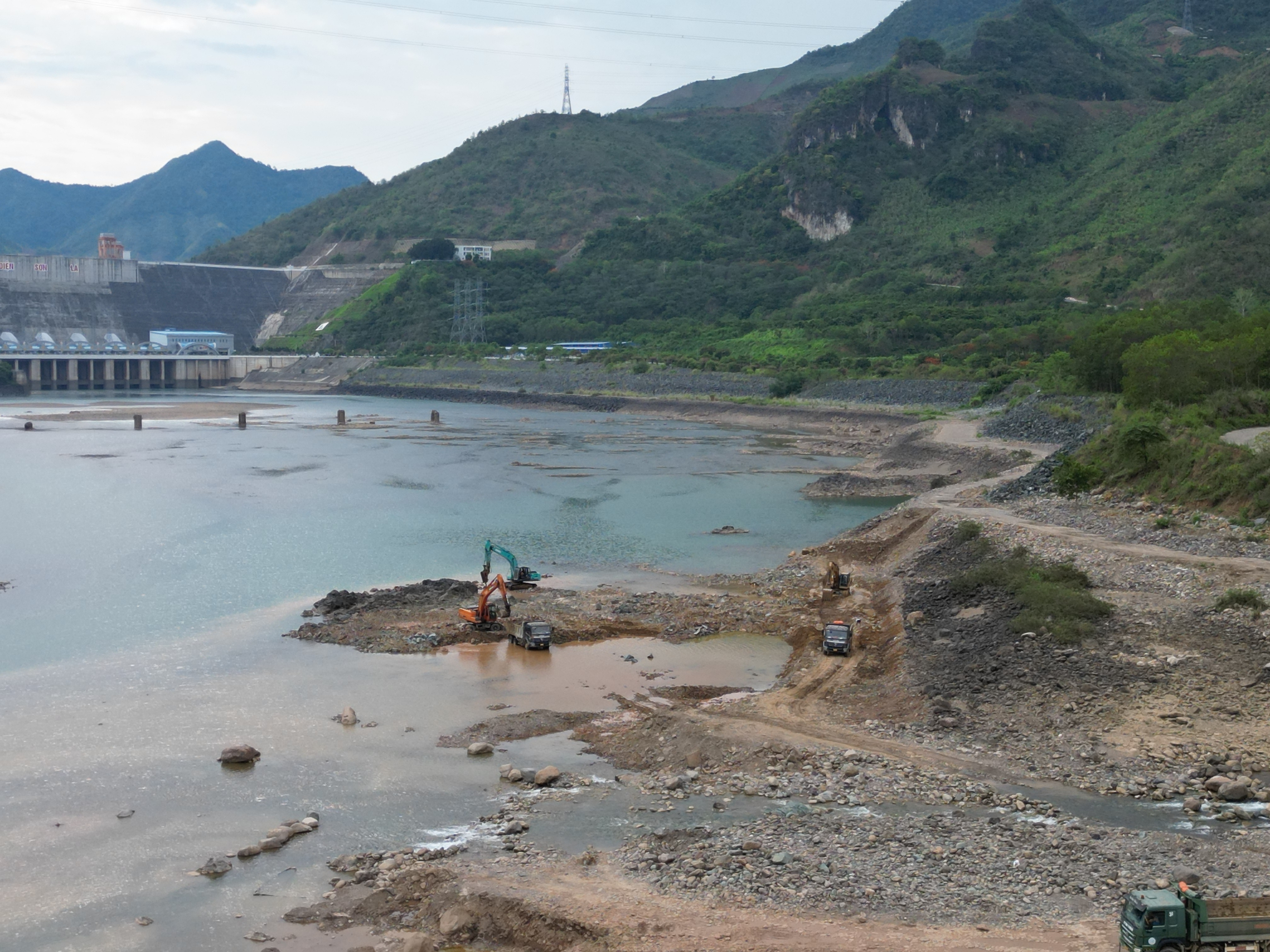 Tại khu vực thượng lưu, nơi hồ thủy điện Sơn La đang tích nước thấy rõ mực nước đã xuống thấp hơn các năm.